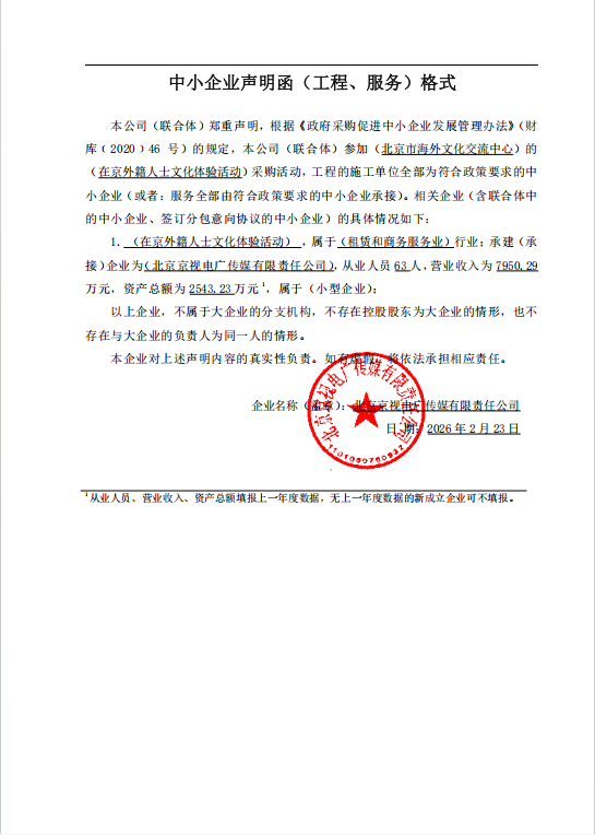 | 北京京视电广传媒有限责任公司 | 1 | 103.9万元 | 103.9万元 | 全年举办两场活动,拍摄制作视频不少于3个,活动境内外新闻稿发布转载不少于80篇。 |