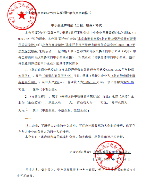 二、项目名称:北京市商业学校(北京祥龙资产经营有限责任公司党校)2026-2027年学校保安服务